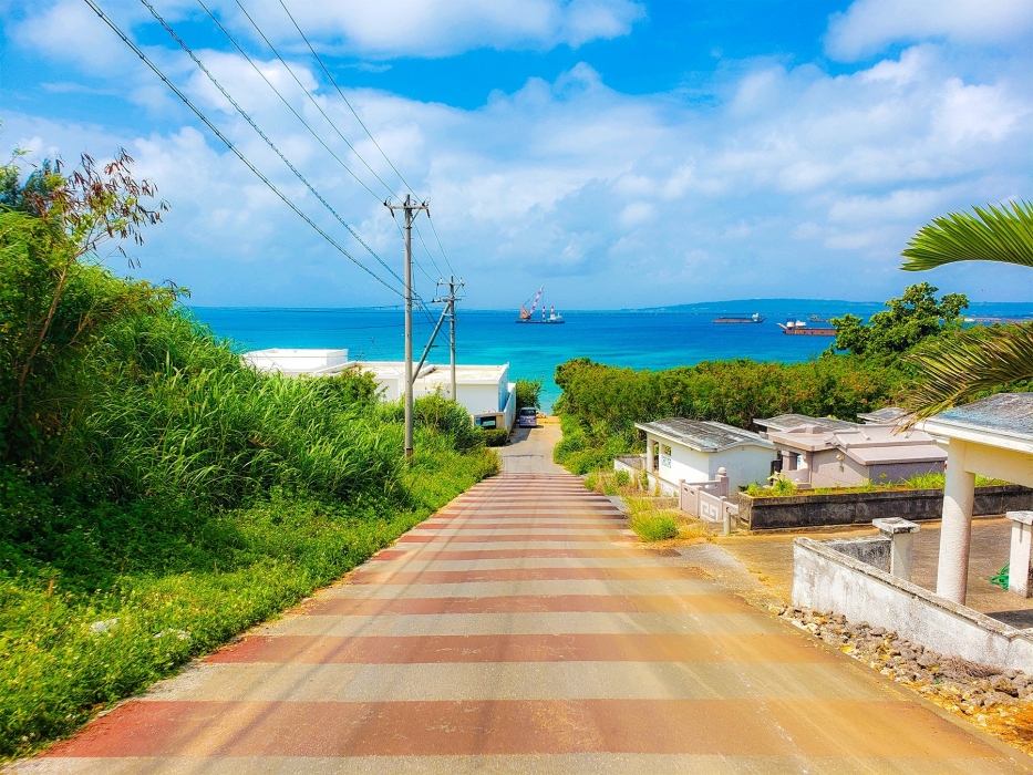 朱色のラインが引かれた真っすぐな道の先に、静かに広がる宮古ブルー。
