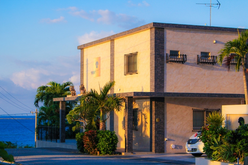 朝日を浴びる本館と、優しく見守るシーサーたちが、一日のはじまりを告げます。
